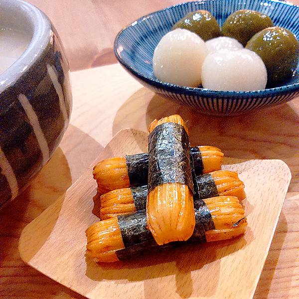 中間放著一小碟米菓,嗯,如果整盤都是甜的吃到最後可能有點膩,穿插這道鹹點,十分得宜