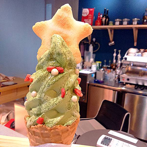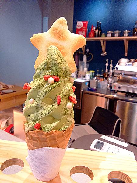 抹茶口味霜淇淋果然好吃,濃濃的茶香,聖誔特別款的造型很應景,頂端加了星星餅乾,像顆聖誔樹,跟老闆借了架子拍照,東拍西拍,正拍的過癮時,老闆提醒Lynn要趕緊吃,不然會溶化,對厚,我都忘了這可是會溶的冰品