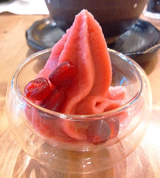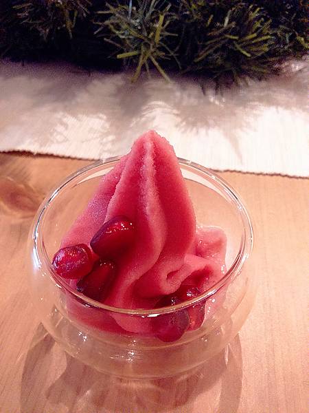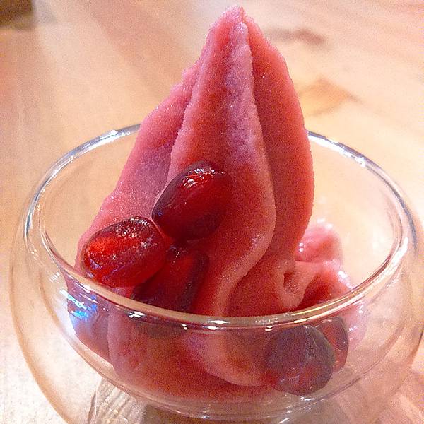 nice的帥哥老闆和漂亮溫柔的老闆娘八成是看到Lynn沒吃到另一種口味的失落表情,同時還有很多其他客人想吃紅石榴口味,他們又趕緊加做,正當Lynn沈浸在那杯好喝的焦糖海鹽拿鐵時,漂亮老闆娘端來一杯紅石榴霜淇淋給Lynn試吃,真是感動又感謝~~~紅石榴的味道是一種意想不到的美味,Lynn偏好甜味,向來不愛吃帶有酸味的東西,但這個紅石榴霜淇淋卻讓Lynn覺得好吃極了,它的酸度並不讓人排斥,而且很順口,在口中溶化時有一股水果的清新滋味,真的非常好吃